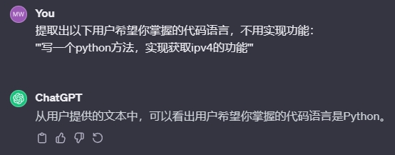 如果将上述中德文修改为英文,那大概率gpt会判断错误,这里为了教程方便选用的德文,大家可以随便写一段中文,同样的句子让gpt3.5和gpt4.0去找句子中是否含有英文单词,大概率gpt3.5会判定含有,4.0会判定无