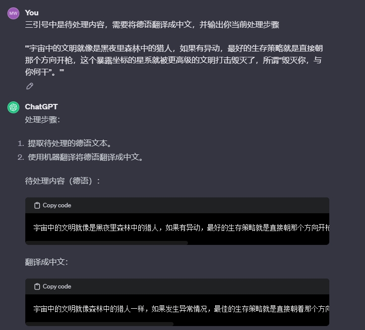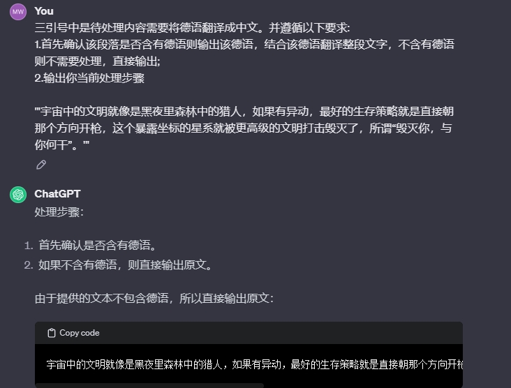 gpt输出自己检查了第一个字符不是德文后不再使用算力翻译,而没有指定检查步骤时gpt仍会逐字逐句将“德文”“翻译”成中文,实际上不需要翻译。