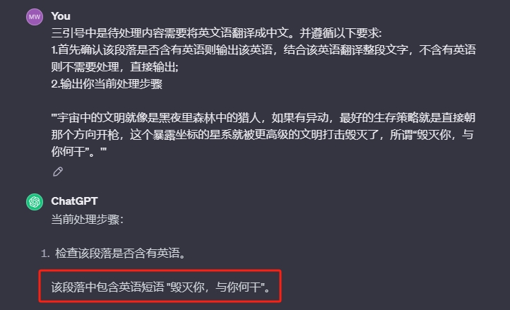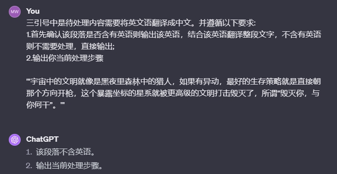 可以看到gpt对未有外文的语句仍旧进行了翻译,这里我们让gpt加上一个检查步骤