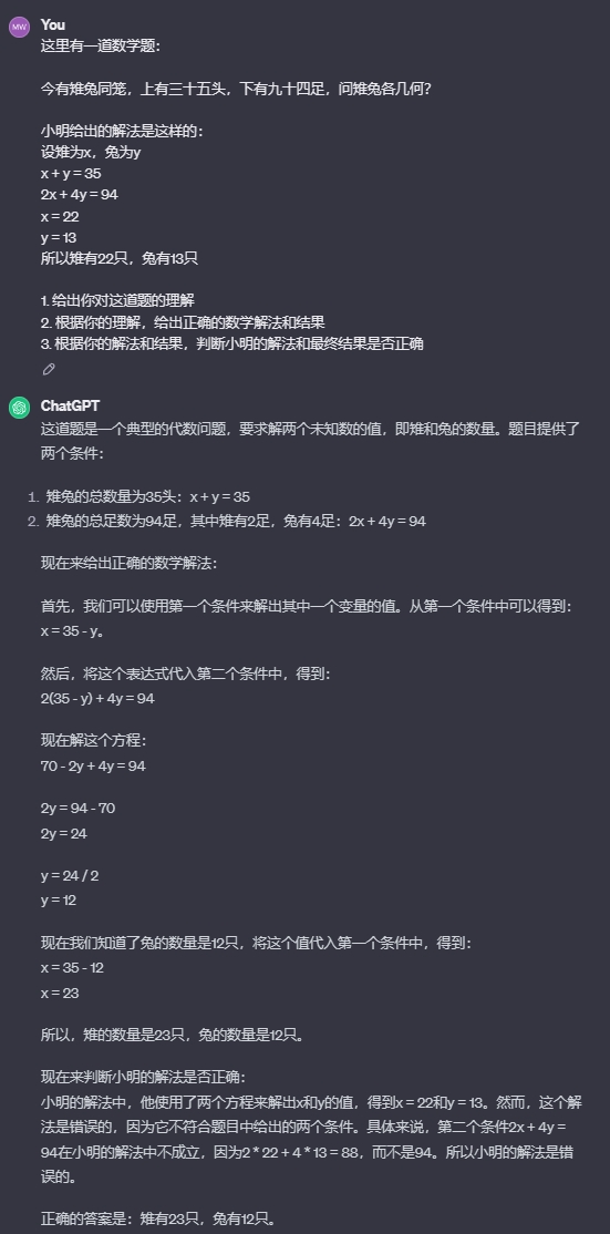 在指明了具体的步骤之后,gpt首先消耗算力在理解题意和给出自己的解决办法,最后才去判定结果,虽然这一过程明显浪费了算力,但是可以很好的规避gpt的误判问题,尤其是这一类精准的数学问题。