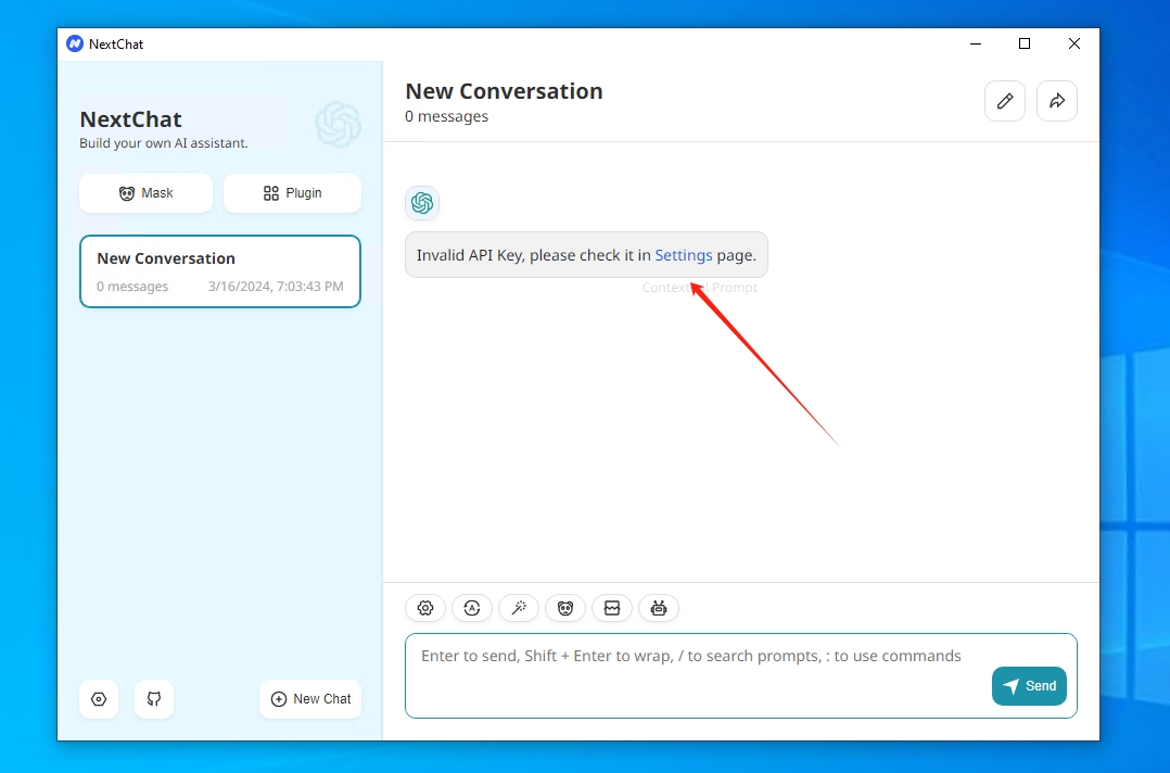 这里提示的意思是需要你配置对应的 API,因为这个软件是利用 API 搭建的一个聊天框架,如果你想要使用,还是需要配置对应的 API 的。这里直接点 Settings,就可以进入到对应的软件配置界面中,进入后往下拉找到如图所示的位置: