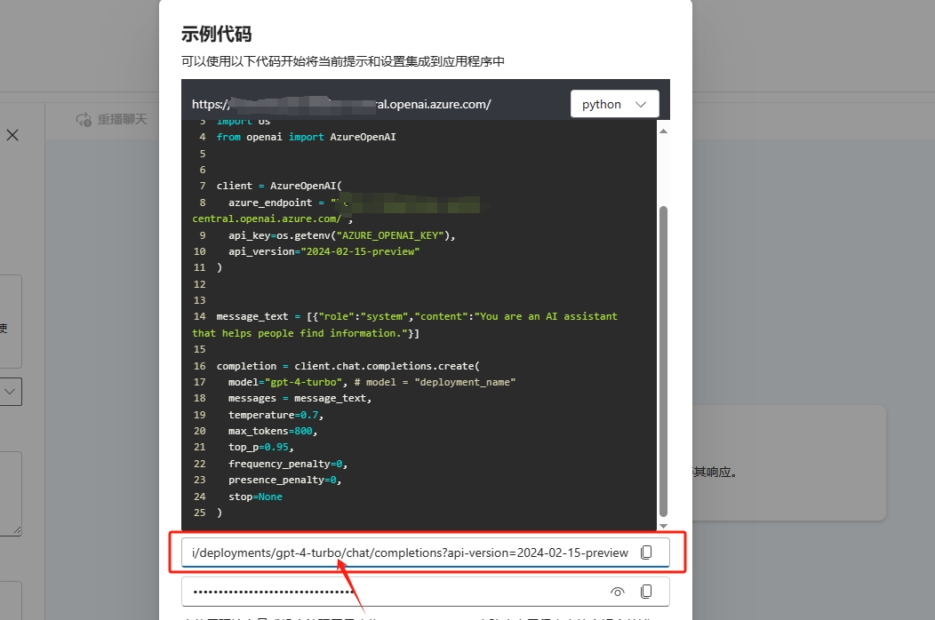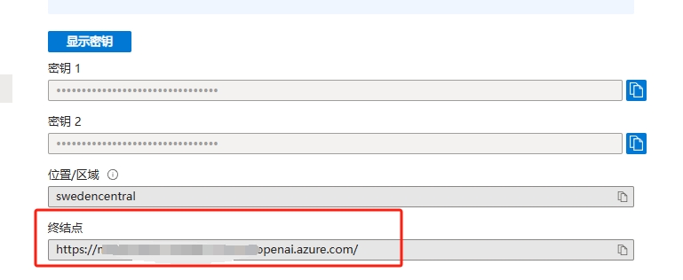 然后接口地址这里注意了,并不是直接使用的如下图所示的 Azure 提供的终结点,而是需要拼写出对应的模型 ID