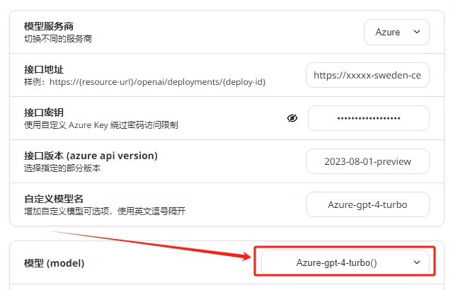 再填入对应的密钥(也就是 Azure 示例代码的接口地址下一栏即是),再填入自定义模型名,这里自定义模型名主要是为了使用时选择模型方便,比如笔者这里就写的是 Azure-gpt-4-turbo,然后再在下面模型一栏中选择填好的模型名,下面的参数建议默认即可,所有信息填好之后如图下所示: