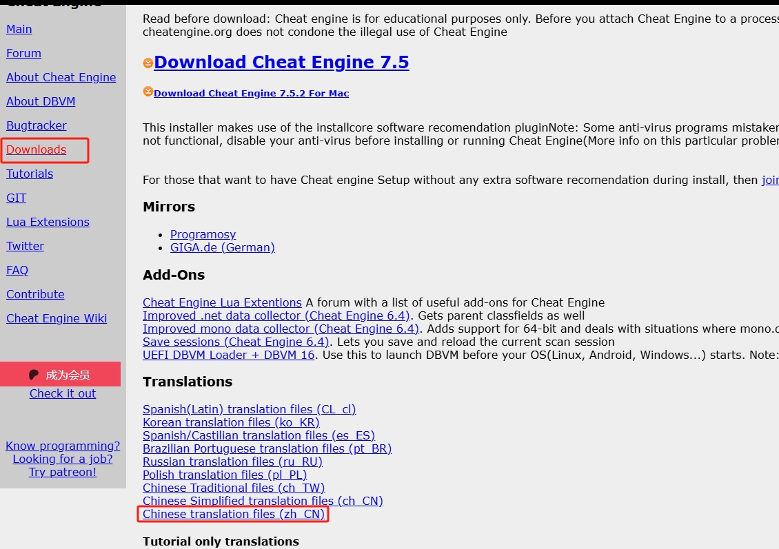 进入官网Cheat Engine,如下图,选择Downloads,然后点Chinese translation files (zh_CN)