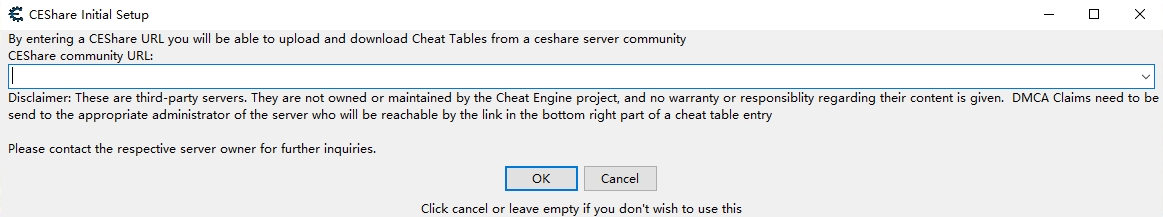 首次启动软件,会弹出两个窗口,一个是提示你可以输入CEshare URL去获取别人提供的Cheat Table,这里简单理解就是自己懒得写,直接获取别人写的外挂。一般可以输入如下链接即可: