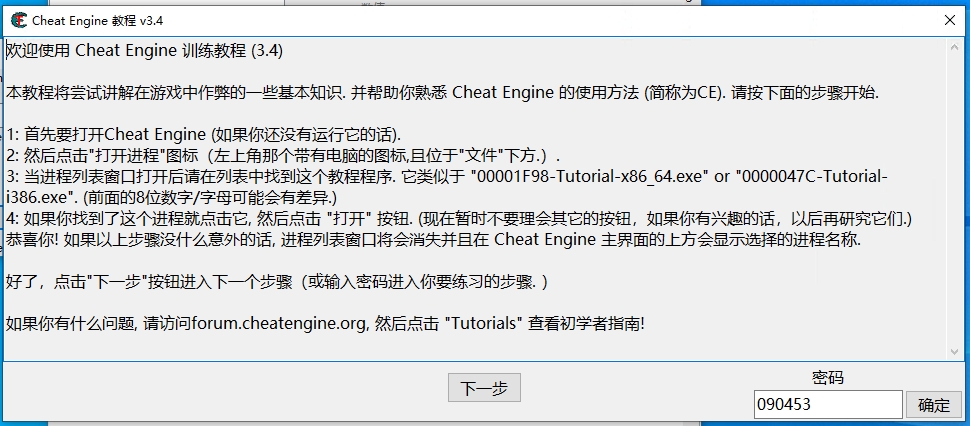 另一个提示就是是否学习软件教程的,如下图就可以看出,CE的软件教程是一种寓教于乐的“考试”,这里CE会在教程中出各种各样的题目让你使用刚刚安装的CE,去掌握CE的各种能力,笔者是非常推荐大家去学习该教程的。