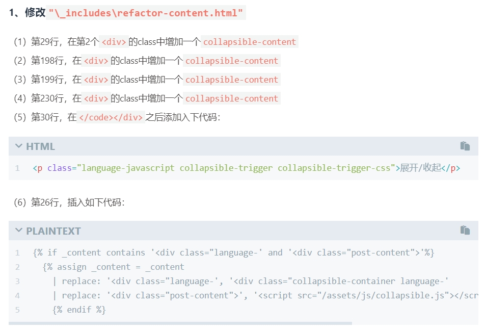 {% if _content contains '<div class="language-' and '<div class="content">'%} {% assign _content = _content | replace: '<div class="language-', '<div class="collapsible-container language-' | replace: '<div class="content">', '<script src="/assets/js/dist/collapsible.js"></script><div class="content">' %} {% endif %}展开