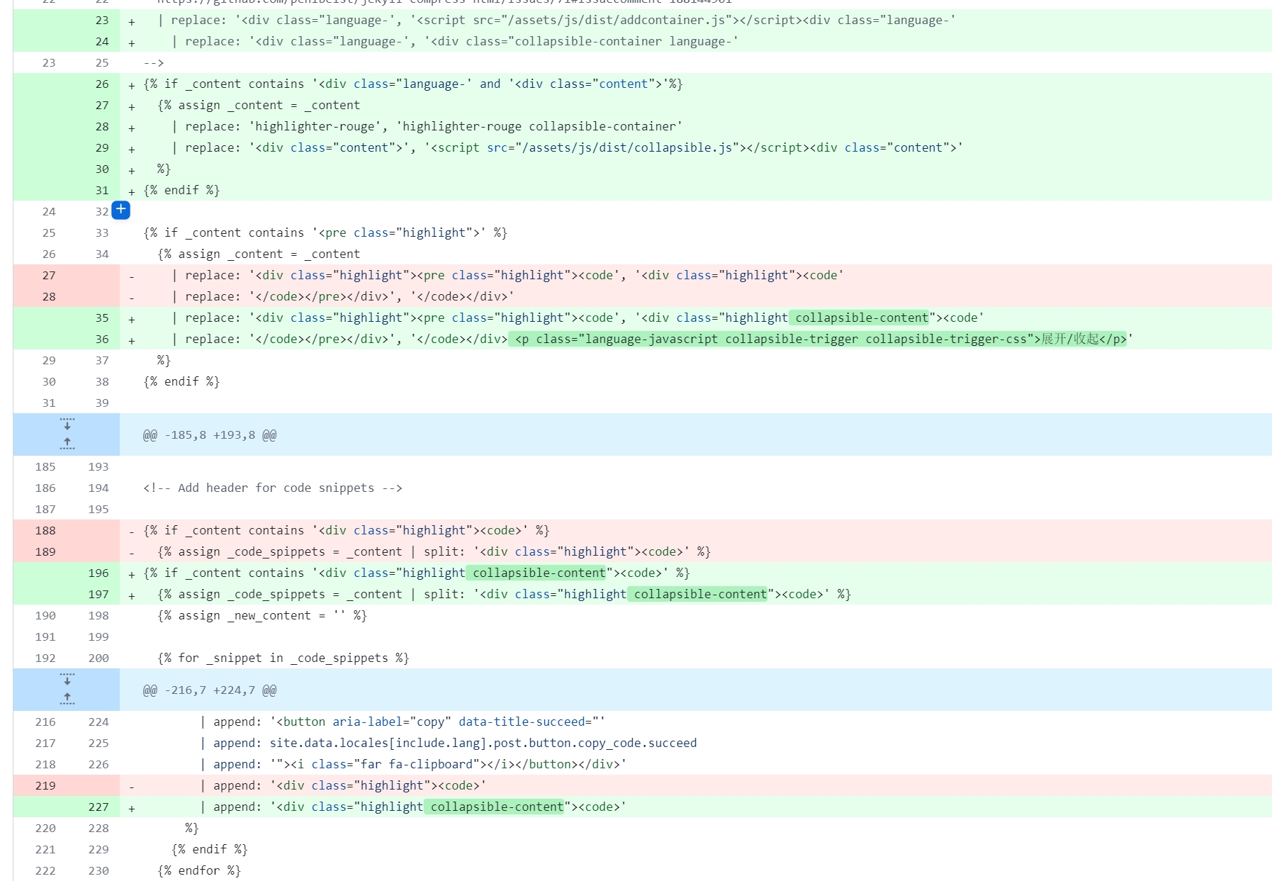 我尝试对照了下,发现应该时对不上号了,于是去chirpy主题找到了3年前的代码,对照3份代码看了下,完成了修改,这里其实就是在所有class为highlight的容器中添加一个collapsible-content自定义容器,然后增加了一段替换容器和js的逻辑;