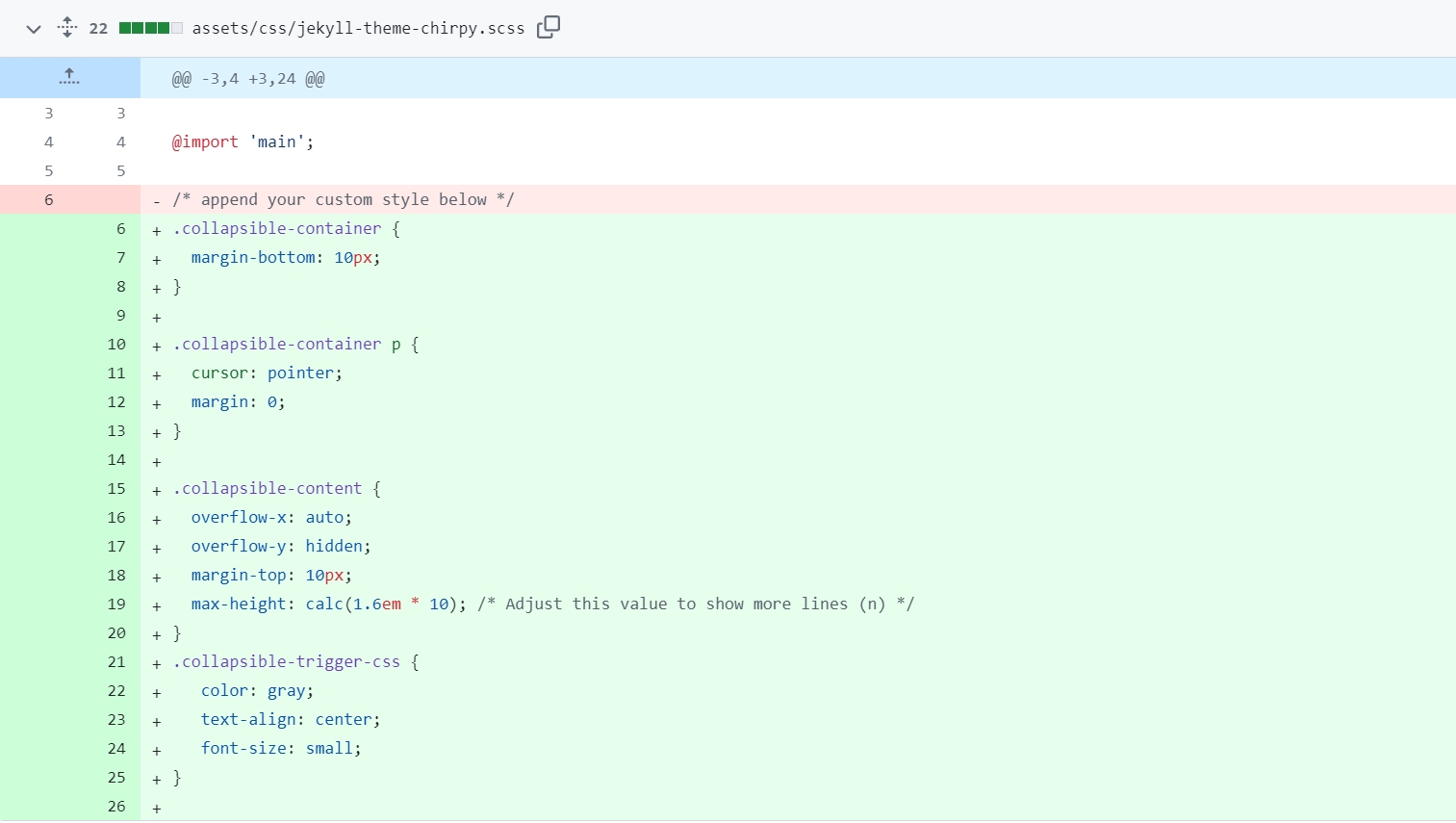 我之前有用过其他的blog网站,都会在代码过长时进行自动的折叠,目前使用的chirpy主题还没有提供自动折叠的能力,这里笔者找到了一个方法可以添加这个能力。