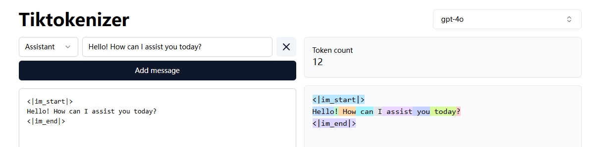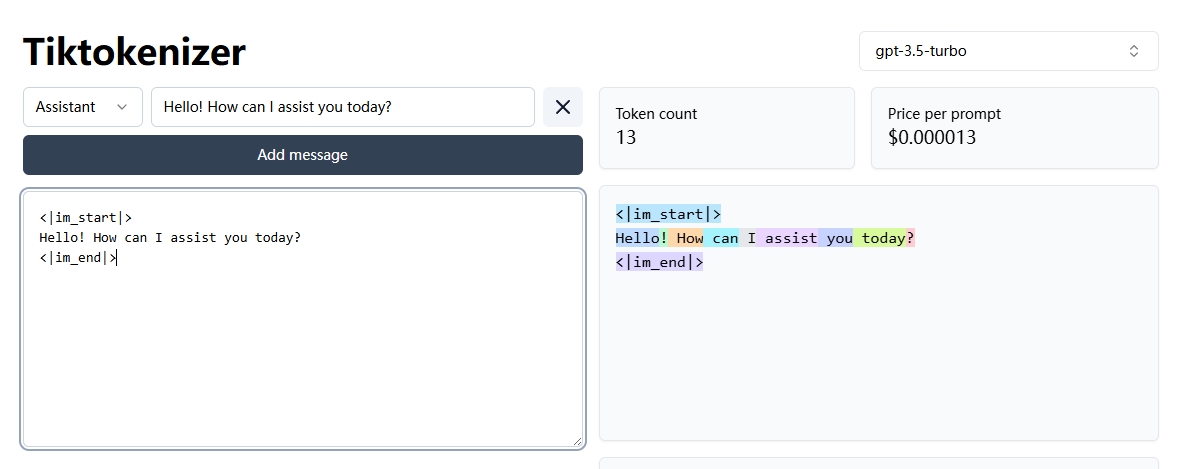 | 纯文本 “Hello! How can I assist you today?” 确实是 9 个 token,添加 < | im_start | > 和 < | im_end | > 后,总 token 数增加到 13 个。 |