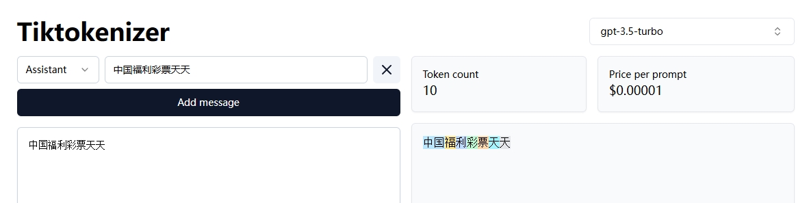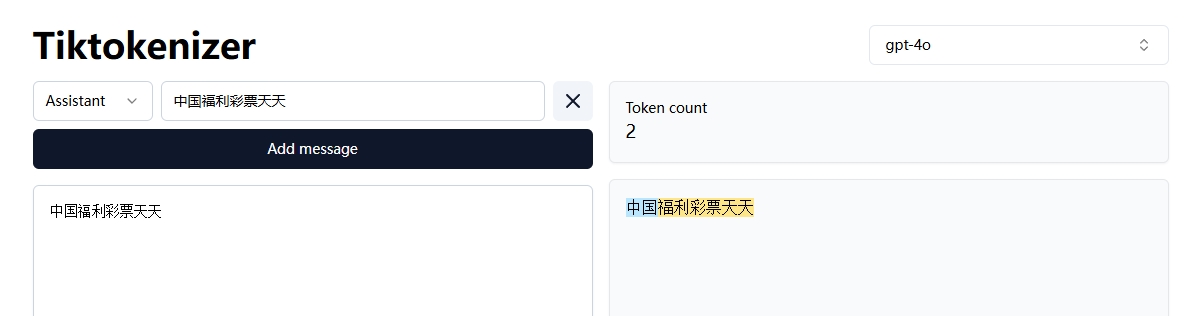 这里OpenAI在推出gpt-4o时,为gpt-4o配置了一个全新的分词器,而且该分词器针对非英文语言的句子拆分为更长的词组,也就是说比如这个“中国福利彩票天天”,在之前的分词器中,会有10个token,而在新的分词器中只有2个