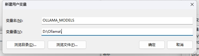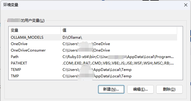如笔者这里需要安装在D盘的Ollama文件夹,则对应的用户环境变量配置如下: