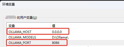 如笔者这里需要设置为局域网可访问,且端口需要修改为8086,则对应的变量应该设置OLLAMA_HOST为0.0.0.0,OLLAMA_PORT为8086: