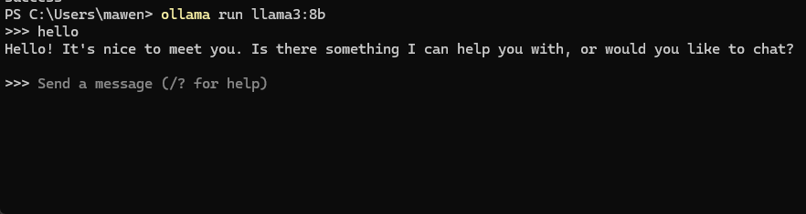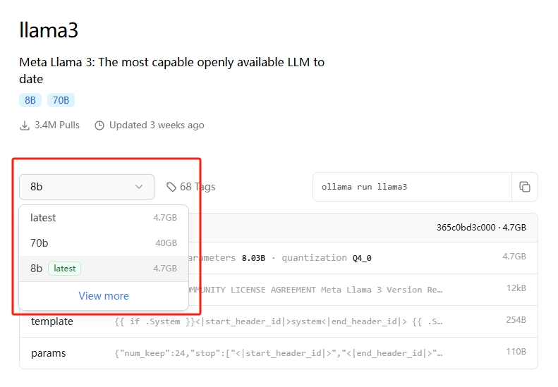 这里有个小tips,llama3的默认模型是8b,所以ollama run llama3和ollama run llama3:8b都会run 8b的模型