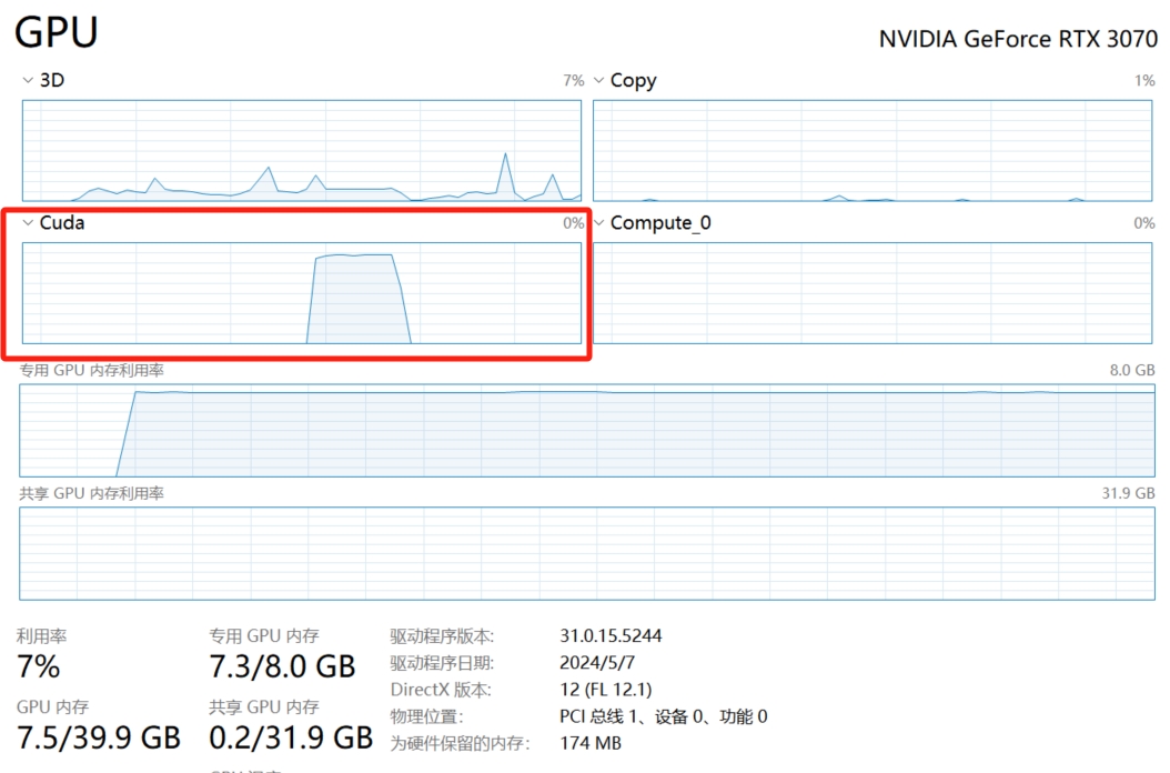 上文提到本地run模型会自动使用显卡算力,这里有个小tips,默认任务管理器的显卡信息显示的利用率并不是对应显卡的算力,如下gif中可以看到其实将Compute 0作为指标更为合适
