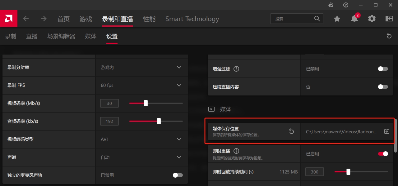 这里以笔者希望配置的amd radeon software中媒体保存位置举例配置下软链接。