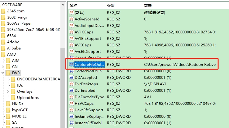 另外笔者这里的问题,实际上也可以直接修改注册表解决,笔者这里是可以有关键词的,比如这个Radeon ReLive是amd显卡软件专用的存储录像的文件夹,直接作为关键字在注册表中搜索即可找到该配置,右键编辑到自己希望的路径即可: